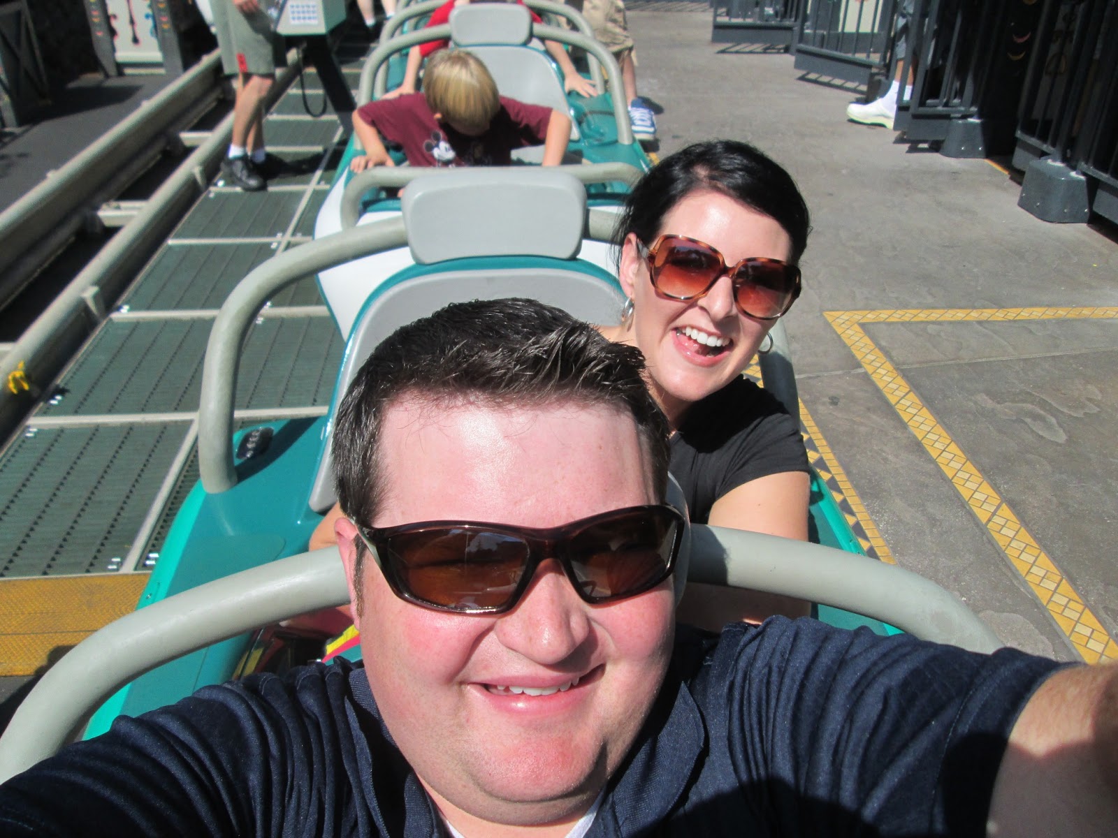 Stewart is standing in front of the city scape (actually just a wall). We had to get really close before Stewart realized that we couldn't actually walk "down" the street :)We rode all the attractions (except the Bear River Run), then headed to the hotel for a siesta. (So nice!) We came back and enjoyed the carnival rides on the pier, ate dinner on the wharf (more clam chowder in bread bowls) and enjoyed the phenomenal "World of Color". I highly recommend seeing that! We had a nice slow romantic evening, and this is where I slacked on taking pictures :)